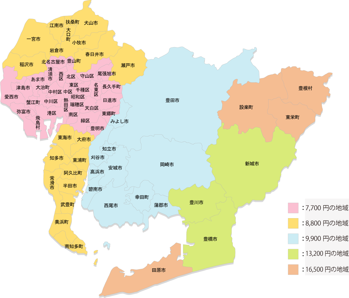 車庫証明申請 報酬一覧表(愛知/岐阜/三重) 行政書士法人アーバンでは、各エリア毎に報酬額を設定しております。ご不明な点はどうぞお気軽にお問い合わせください。報酬額は、税込み表示です。 愛知県 エリア番号愛知エリア報酬額 ①名古屋市全域、愛西市、弥富市、尾張旭市、海部郡、大治町、清須市、津島市、海部郡飛島村、長久手市、日進市、北名古屋市、海部郡、蟹江町、あま市、愛知郡東郷町、豊明市、西春日井郡豊山町7,700円 ②小牧市、稲沢市、岩倉市、知多郡東浦町、常滑市、知多郡美浜町、一宮市、春日井市、大府市、知多郡武豊町、犬山市、丹羽郡扶桑町、江南市、知多市、半田市、瀬戸市、丹羽郡大口町、知多郡阿久比町、東海市、知多郡南知多町8,800円 ③みよし市、安城市、知立市、豊田市、額田郡幸田町、西尾市、蒲郡市、刈谷市、碧南市、岡崎市、高浜市9,900円 ④豊橋市、豊川市、新城市13,200円 ⑤上記以外の愛知県内16,500円 岐阜県 エリア番号岐阜エリア報酬額 ③安八郡安八町、羽島郡岐南町、岐阜市、加茂郡富加町、可児郡御嵩町、大垣市、安八郡神戸町、加茂郡坂祝町、羽島市、美濃加茂市、海津市、各務原市、多治見市、加茂七宗町、加茂郡八百津町、羽島郡川辺町、可児市、土岐市、瑞浪市、安八郡輪之内町、養老郡養老町、加茂郡白川町、加茂郡東白川村13,200円 ④揖斐郡池田町、揖斐郡大野町、不破郡関ケ原町、瑞穂市、山県市、揖斐郡揖斐川町、本巣郡北方町、関市、不破郡垂井町、美濃市、恵那市、郡上市、中津川市、本巣市13,200円 ⑤上記以外の岐阜県内13,200円 三重県 エリア番号三重エリア報酬額 ③桑名市、桑名郡木曽岬町、いなべ市、員弁郡東員町13,200円 ④四日市市、三重郡朝日町、三重郡川越町、三重郡菰野町13,200円 ⑤上記以外の三重県内13,200円